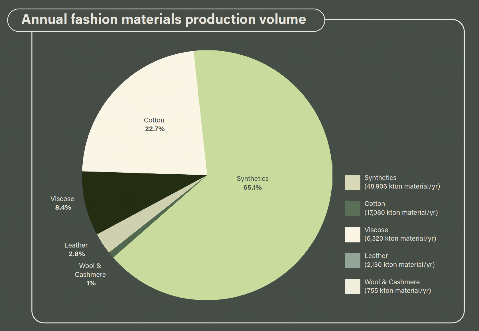 Fig. 2. Estimated distribution of annual production volume of major fashion materials used globally. Volumes are expressed in kilotonnes per year (kton material/yr), representing the approximate scale of fiber production entering the fashion supply chain based on the Textile Exchange Market Report. Synthetic fibers (polyester, nylon, polypropylene, and polyurethane) are grouped as “Synthetics”. Percentages indicate the proportion of each material relative to the total global production of fashion materials.