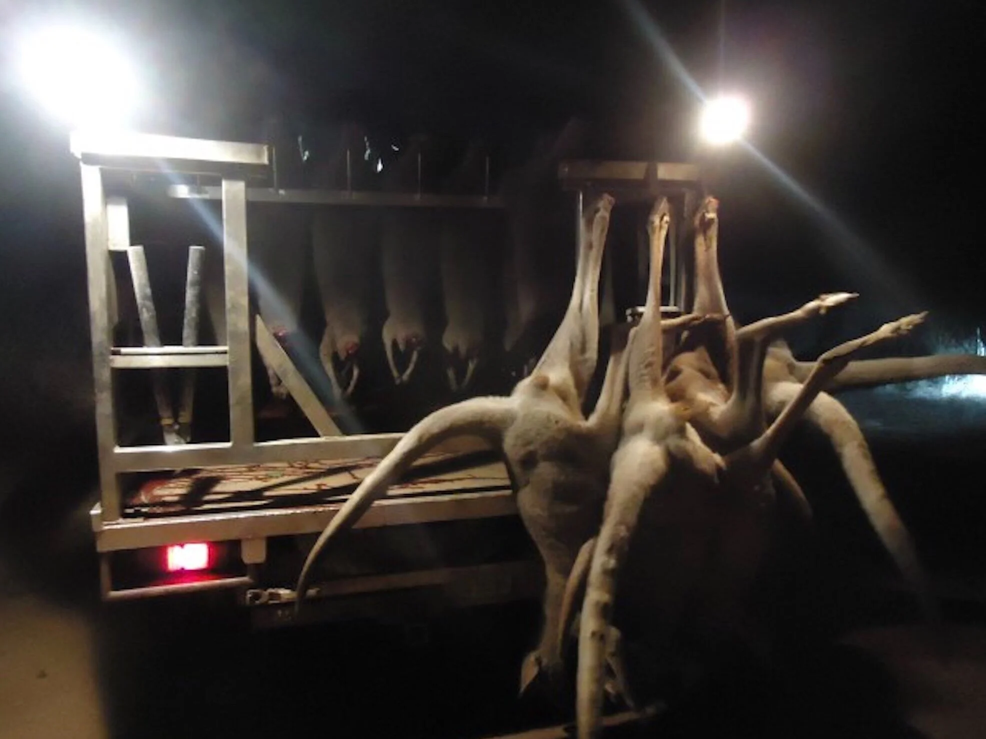 Kangaroos are transported on the backs of open-air trucks, gathering dust, faeces and flies. Current laws allow kangaroos to be kept in rural chillers for up to 14 days before being transported to processors. Chillers have been documented as contaminated with old blood, rusty hooks, dirt and live animals.
