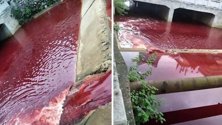 Image: Blood fills a river near a slaughterhouse after a leak // Daily Mail